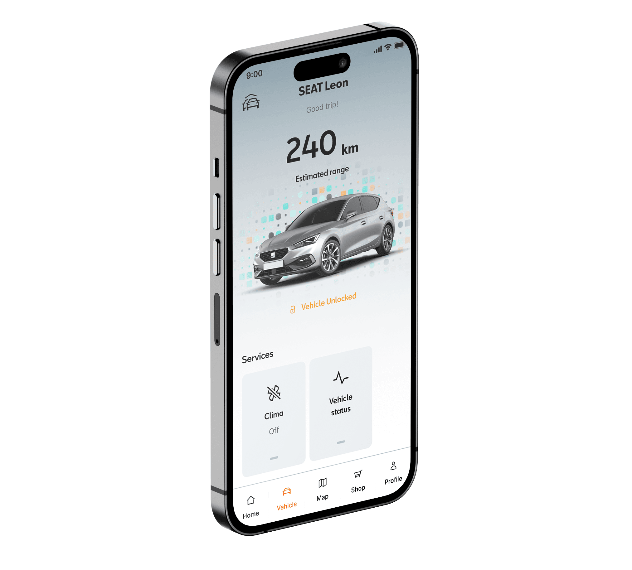 The SEAT app was designed in parallel with CUPRA, using the same structure but reinterpreted through a different visual language.