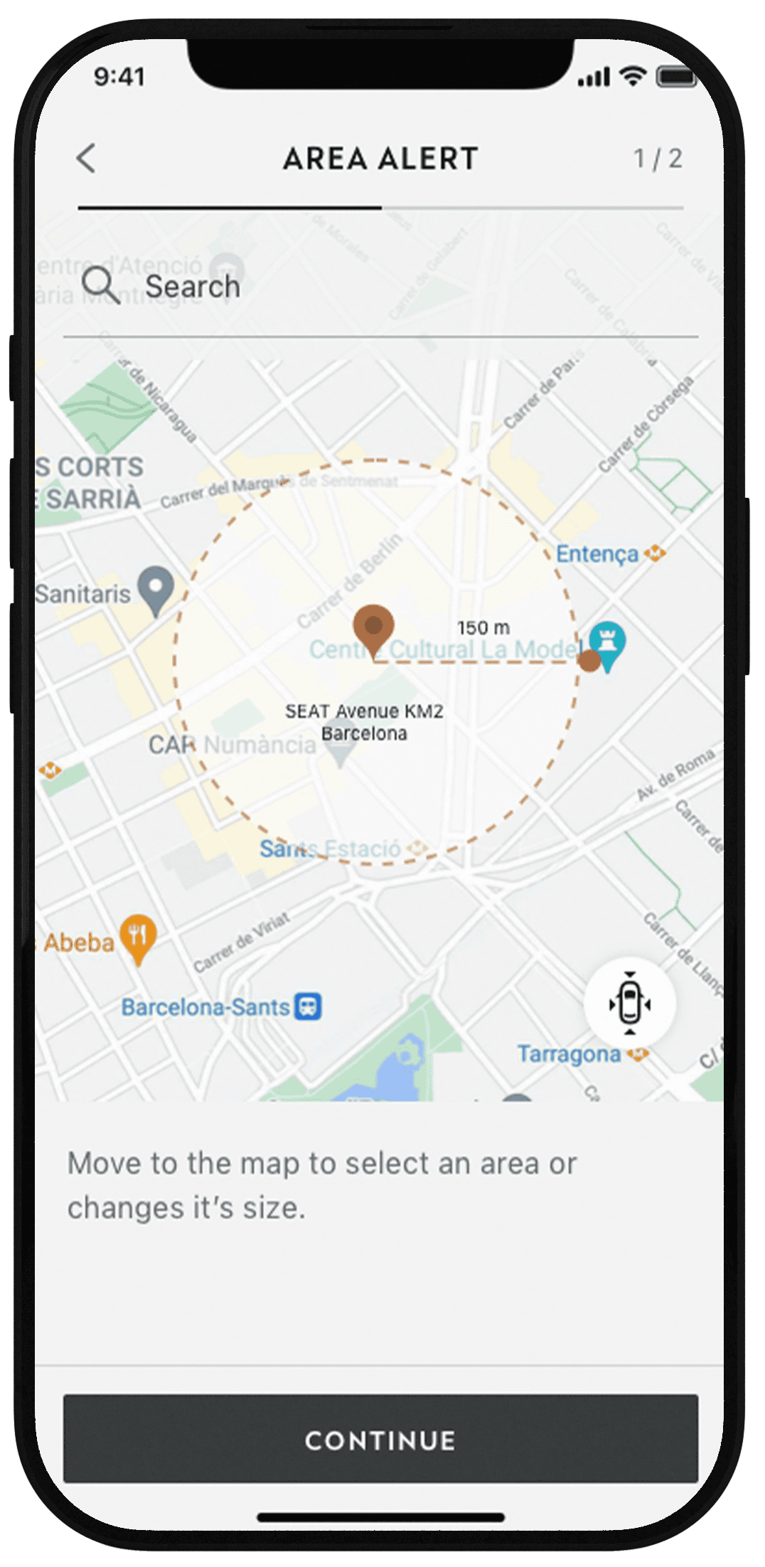 Area Alerts allow users to define a specific area directly on the map and receive notifications when the vehicle enters or exits that zone.