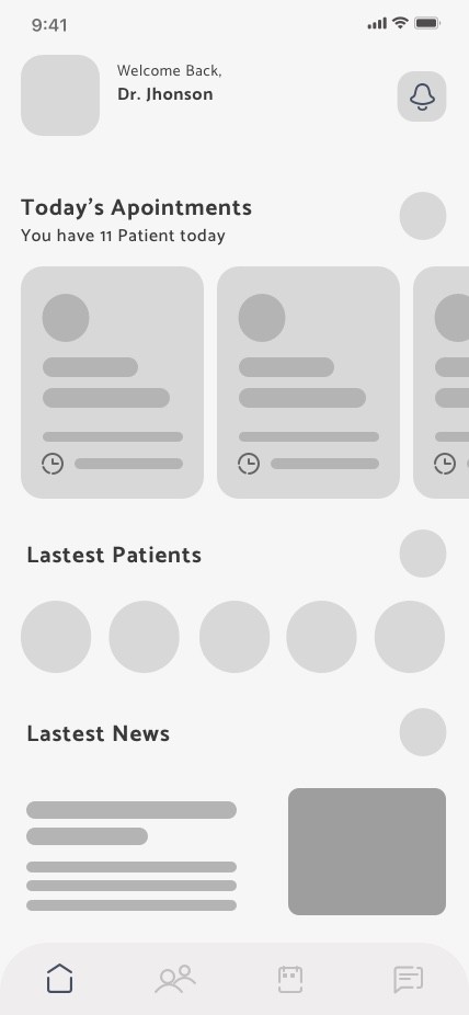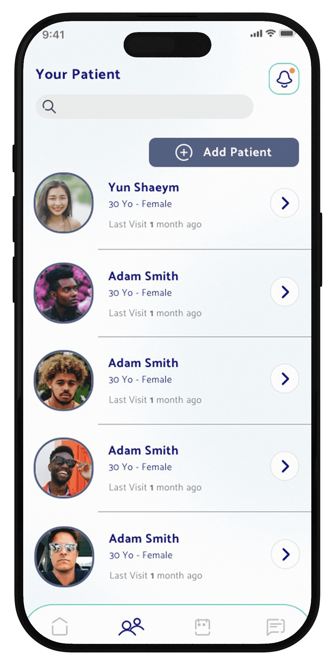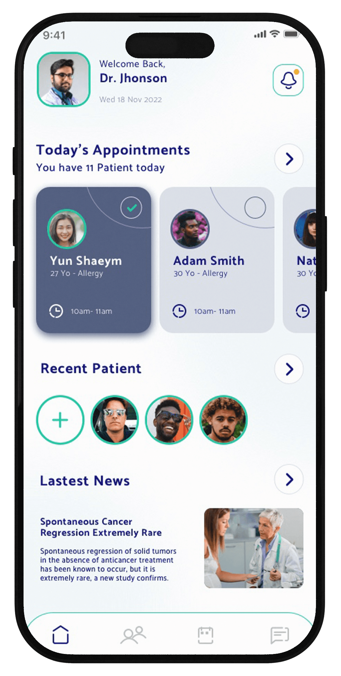 The Home screen is designed to ground the doctor at the beginning of each session. Instead of presenting dense medical data, the interface highlights what matters most in the moment: today’s appointments, recent patients, and relevant updates. The visual hierarchy guides attention naturally, helping doctors orient themselves quickly before moving into action. Soft surfaces, generous spacing, and rounded components reduce cognitive load and support a sense of trust and control in a clinical environment.