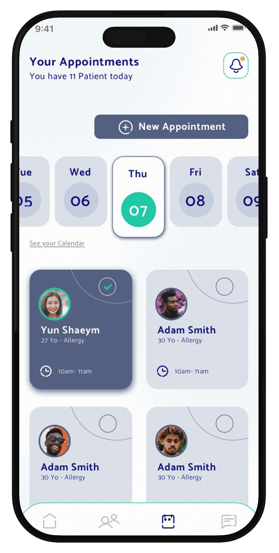 Managing a full day of patients requires speed and clarity. The Appointments screen transforms a complex schedule into a scannable overview, allowing doctors to move effortlessly across days while keeping key information visible at a glance.